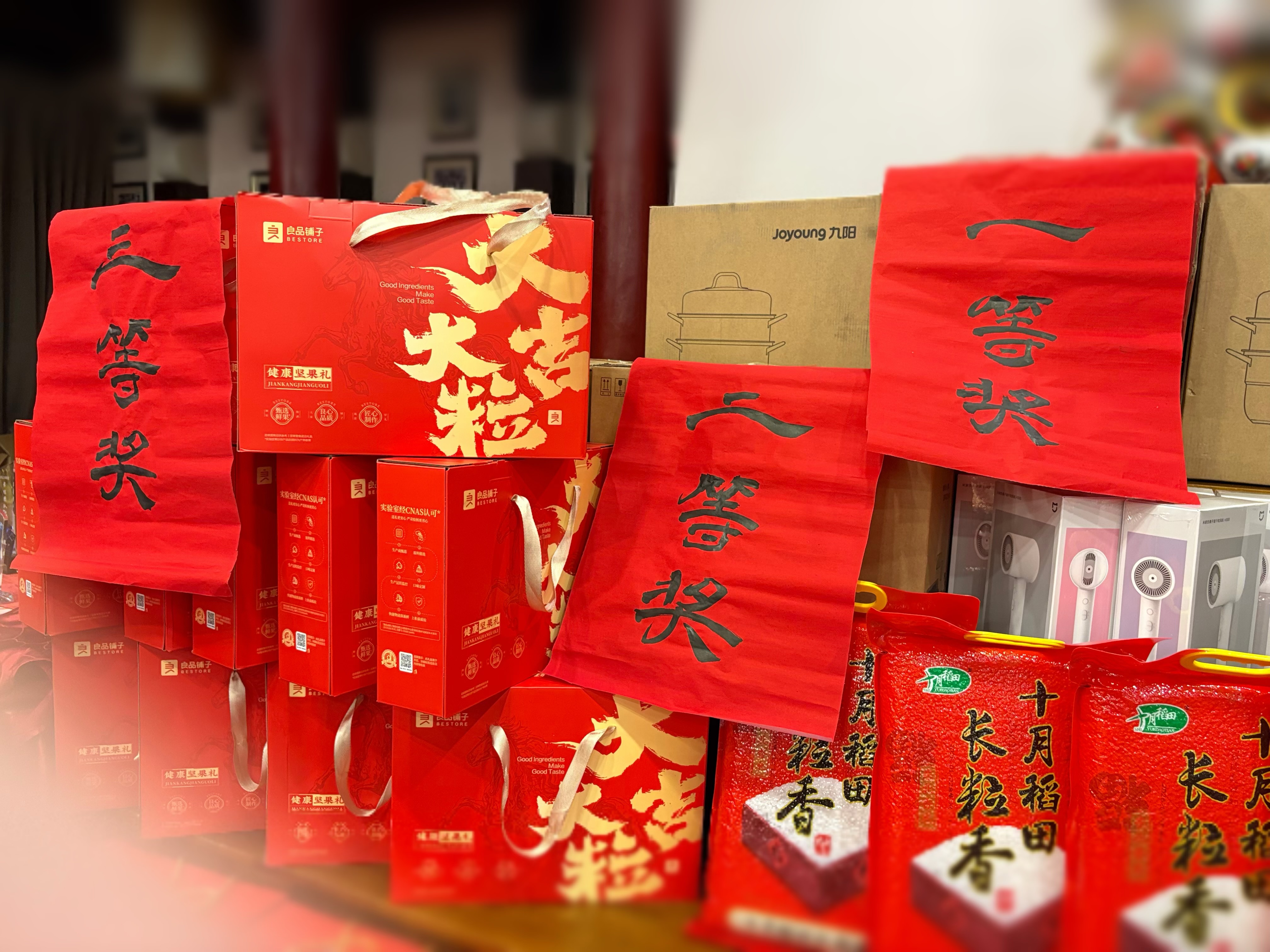 穿插在节目之间的三轮幸运大抽奖,更是一次次点燃了全场的热情。三等奖的良品铺子坚果礼盒与十月稻田大米、二等奖的苏泊尔加湿器与小米吹风机、以及最终重磅一等奖的腰靠坐垫和九阳蒸锅,丰厚的奖品承载着公司的祝福与关怀,陆续被幸运儿们收入囊中,惊喜的欢呼声与热烈的祝贺声交织,将欢乐的氛围推向一波又一波的高潮。